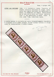 1946, 1 L. dunkelpurpur/dunkelbraun, Tridentinisches Konzil, postfrischer senkr. 5er-Streifen, dabei zwischen der 2. und 3. Marke ungezähnt, die untere Marke unten ungezähnt und oben mit einer 3-fach Zähnung, Fotoattest Raybaudi, Sassone ca. 800,- EuroFixed Price