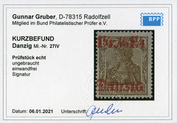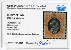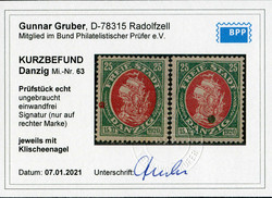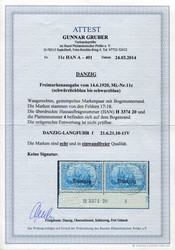 1920, 2 M. Aufdruckausgabe, schwärzlichblau, waagerechtes Paar vom Unterrand mit HAN 3374.20 und Plattennummer 4, gestempelt "DANZIG- LANGFUHR f 21.6.21.10-11V", Fotoattest Gruber BPP 03/2014, danach zeitgerechte Entwertung aber nicht prüfbar, "echt und einwandfrei", bereits die beiden Einzelwerte in der guten Farbe werten gestempelt 3.600 Euro, seltenes AngebotFixed Price