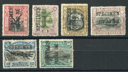 1895, 2 C. bis 24 C. Landesansichten mit Aufdruck "POSTAGE DUE" und zusätzlichem Aufdruck "SPECIMEN", ohne 5 C., sieben ungebrauchte Einzelwerte, dabei der Wert zu 18 C. mit senkr. Aufdruck "POSTAGE DUE", farbfrisch und wie üblich gezähnt, einwandfreiFixed Price