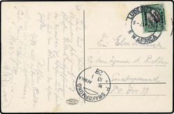 1931, "DEUTSCHE SEEPOST OST-AFRIKA-LINIE m 2.11.31", als klare Entwertung auf Brief vom Postdampfer "WANGONI", adressiert nach Erkner bei Berlin, dazu Inlandspostkarte aus Lüderitz 8. Jan. 1928 nach Swakopmund mit dem aptierten dt. Stempel "SWAKOPMUND S.W. AFRIKA" als Ankunftsstempel, beide Belege saubere QualitätFixed Price