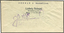 1945, Dienstbrief Kath. Pfarramt Senden (Iller) mit Ra Gebühr bezahlt ab Senden (Iller) 20.8.454 an Bayr. Vereinsbank Günzburg. Rückseite mit Namensstempel eines US-Reisenden Zensor I.st Lieutn. Lokale Zensur, nur aus dem Raum Ulm bekannt. Senkr. Faltung und geringe Beförderungsspuren.Fixed Price